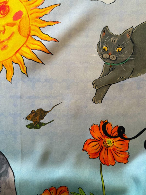 "Hello, my name is Monky, I am a British Short Hair, I live in Park Klarenbeek Arnhem. My favorite things to do are day dreaming, catching mice, climbing trees and sleeping on our lawn. I do also have a job, I am a key inspiration for Cui Xun Art and Design, here are some scarf designs based on my daily life and our forest garden, do you like them?"