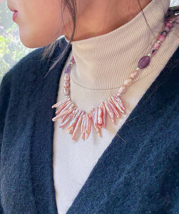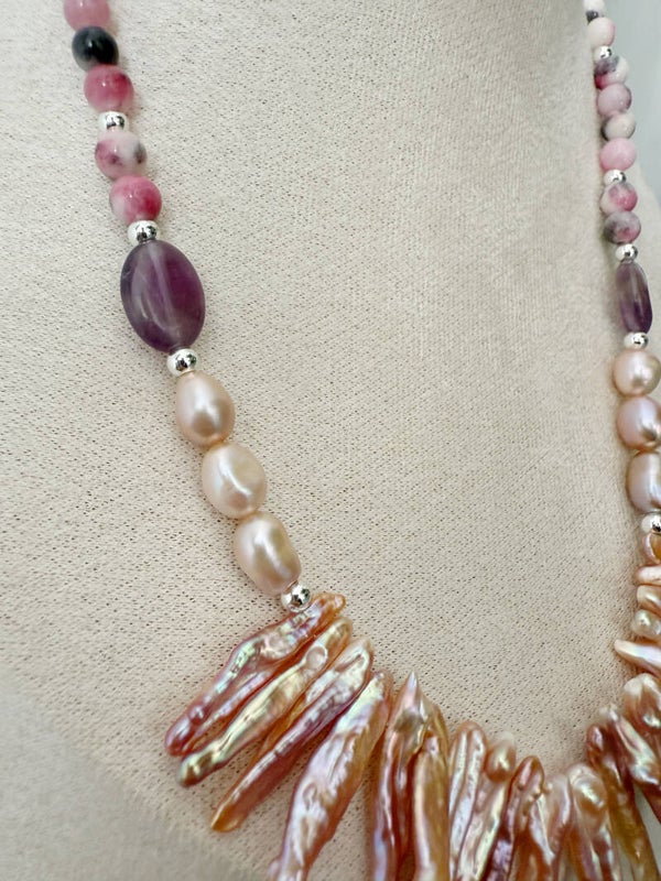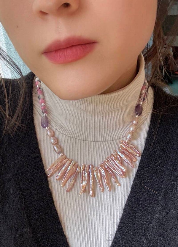 handmade with Natural pink Freshwater Pearl + Amethyst +jade
